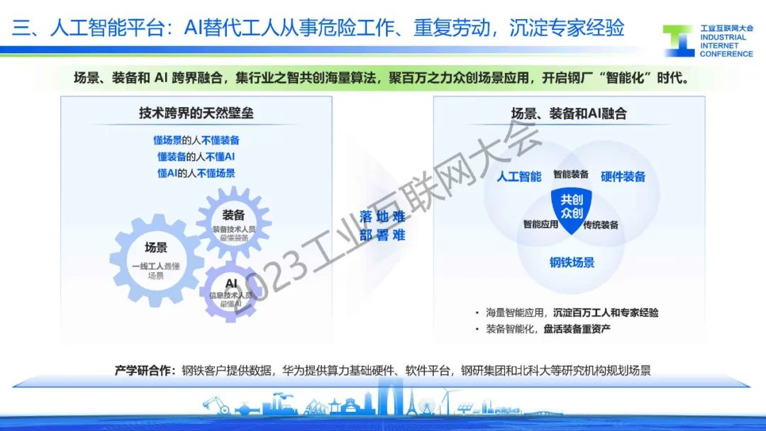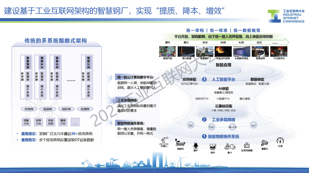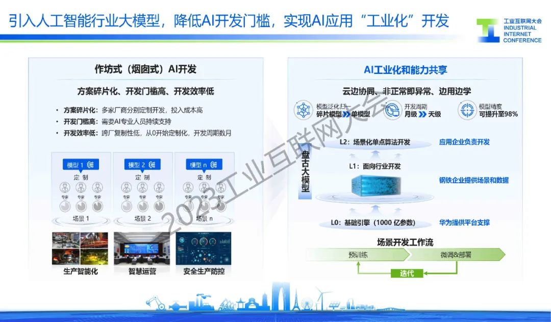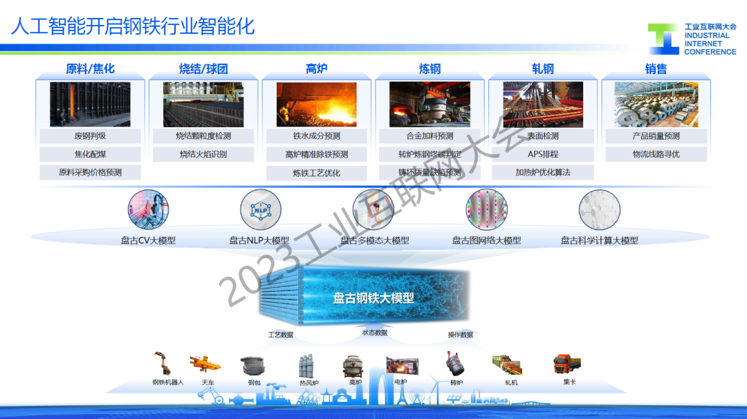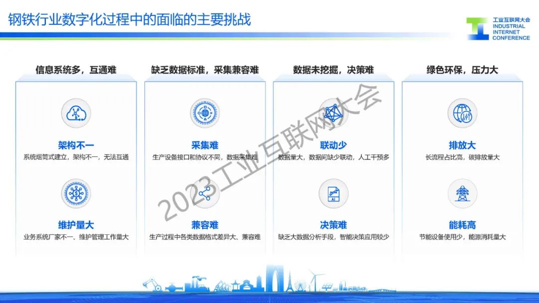 胡罡介紹,鋼鐵行業(yè)處在數(shù)字化轉(zhuǎn)型的爆發(fā)期,智能化應(yīng)用不斷涌現(xiàn),在這過程中還面臨著信息系統(tǒng)、數(shù)據(jù)標(biāo)準(zhǔn)和環(huán)保等主要挑戰(zhàn)。目前,通過建設(shè)基于工業(yè)互聯(lián)網(wǎng)架構(gòu)的智慧鋼廠,來實(shí)現(xiàn)”提質(zhì)、降本、增效“的目標(biāo),同時(shí)引入人工智能行業(yè)大模型,降低AI開發(fā)門檻,實(shí)現(xiàn)AI應(yīng)用“工業(yè)化”開發(fā),開啟鋼鐵行業(yè)智能化。