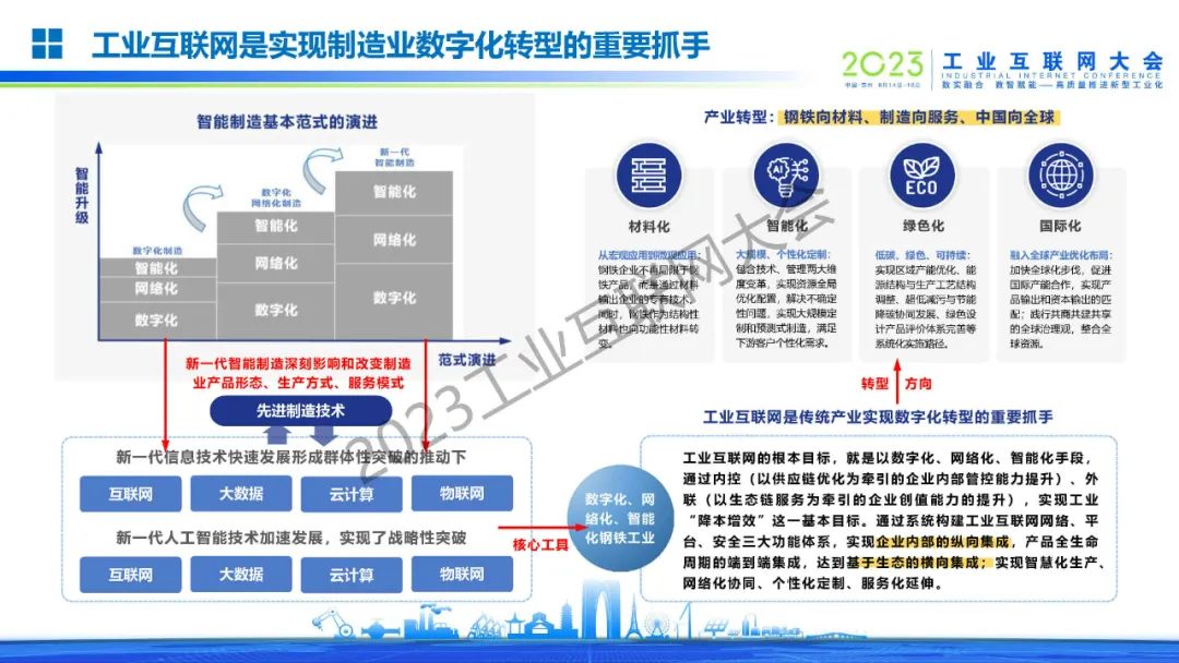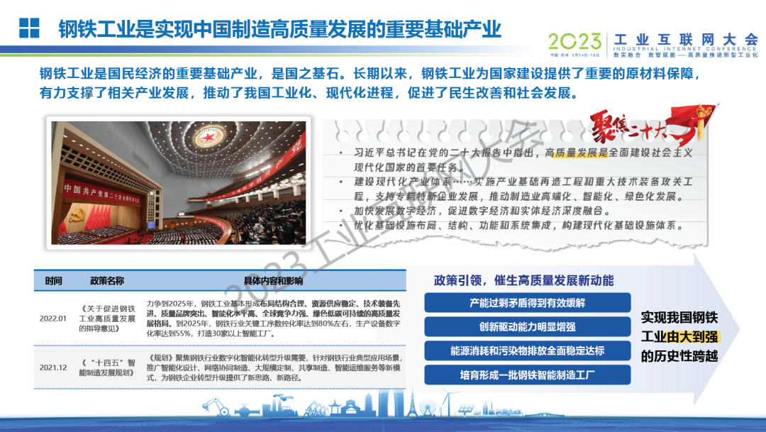 姜濤介紹,鋼鐵工業迎來高端化、智能化、綠色化發展新時代,是國民經濟的重要基礎產業,是國之基石。工業互聯網是鋼鐵行業數字化轉型的驅動力。將數字技術與鋼鐵行業深度融合,推動鋼鐵企業從傳統五級信息化架構到工業互聯網的轉化,實現企業內部的縱向集成,產品全生命周期的端到端集成,達到基于產業生態的橫向集成;形成智慧化生產、網絡化協同、個性化定制、服務化延伸的鋼鐵新興業態和應用模式。