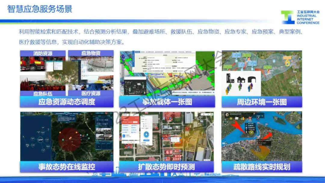 “智慧應急服務場景利用智能檢索和匹配技術,結合預測分析結果,典型案例疊加避難場所、救援隊伍、應急物資、應急專家、應急預案、醫療救援等信息,實現自動化輔助決策方案。”