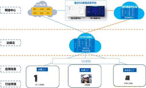 推進5G與邊緣計算、網絡切片的融合。將MEC、UPF從運營商的機房下沉到海爾園區內,實現了算法上移到MEC,滿足了數據不出廠和部分場景對于高可靠性低時延的要求。并且滿足了滿足不同業務場景對網絡的差異化需求及業務隔離要求。
