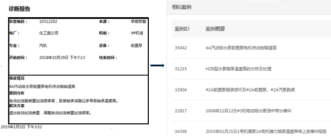 南京化學(xué)工業(yè)園熱電有限公司2018年10月29日從預(yù)警系統(tǒng)推送至診斷系統(tǒng)一條告警信息:“前置泵電機(jī)軸承溫度高”,診斷系統(tǒng)根據(jù)告警信息推薦的案例中詳細(xì)介紹了前置泵電機(jī)軸承溫度高的主要原因與處理方法,用戶參考推薦案例,判斷軸承溫度高的原因?yàn)闈?rùn)滑油過(guò)量,通過(guò)調(diào)整自動(dòng)加油裝置的加油頻率解決了該問題,而這一案例也作為新的案例進(jìn)入了知識(shí)庫(kù),當(dāng)該問題再次發(fā)生時(shí),診斷系統(tǒng)會(huì)立即推送該案例給用戶,起到知識(shí)傳承的作用,診斷過(guò)程參見圖16。