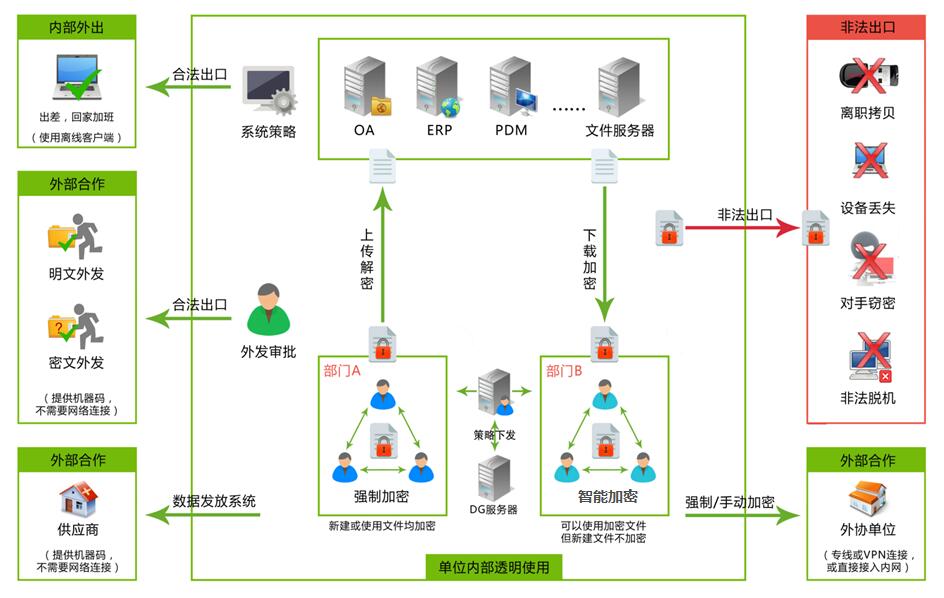 (3)平臺數據及因公外出數據使用安全管控防護:實現對移動設備在外使用過程中全程保護,有效的杜絕外出人員主動和被動的數據泄密,實現了外出移動設備的授權使用、安全認證和電子文件的便捷高效、安全可用。