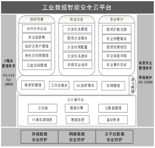 針對工業設計數據面臨的三大威脅,工業數據智能安全云平臺構建了面向工業設計數據全生命周期安全管理的解決方案,包括工業圖紙協同研發設計環節的安全可控,及圖紙下單給外協方的電子商務結算環節、出圖進行資源調配確定生產計劃環節,直至下發至智能車間生產環節,及后續產品發布環節的圖紙安全控制問題。