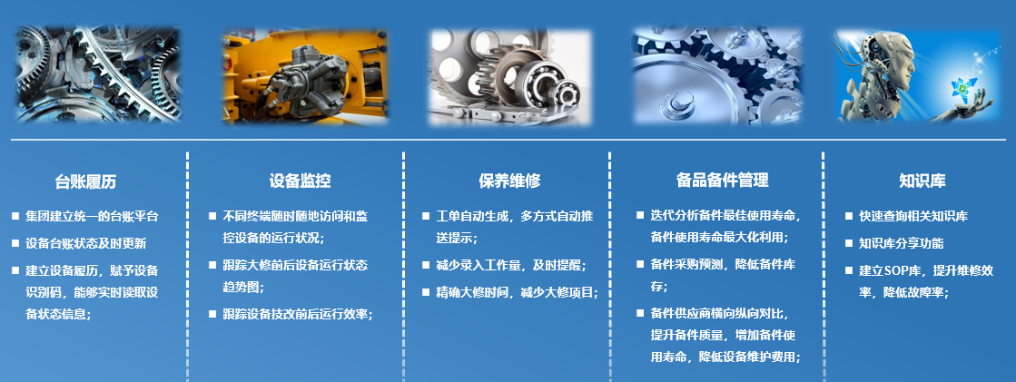 在設備管理場景中,具備設備臺賬、設備監控、設備維護、備品備件管理等功能。