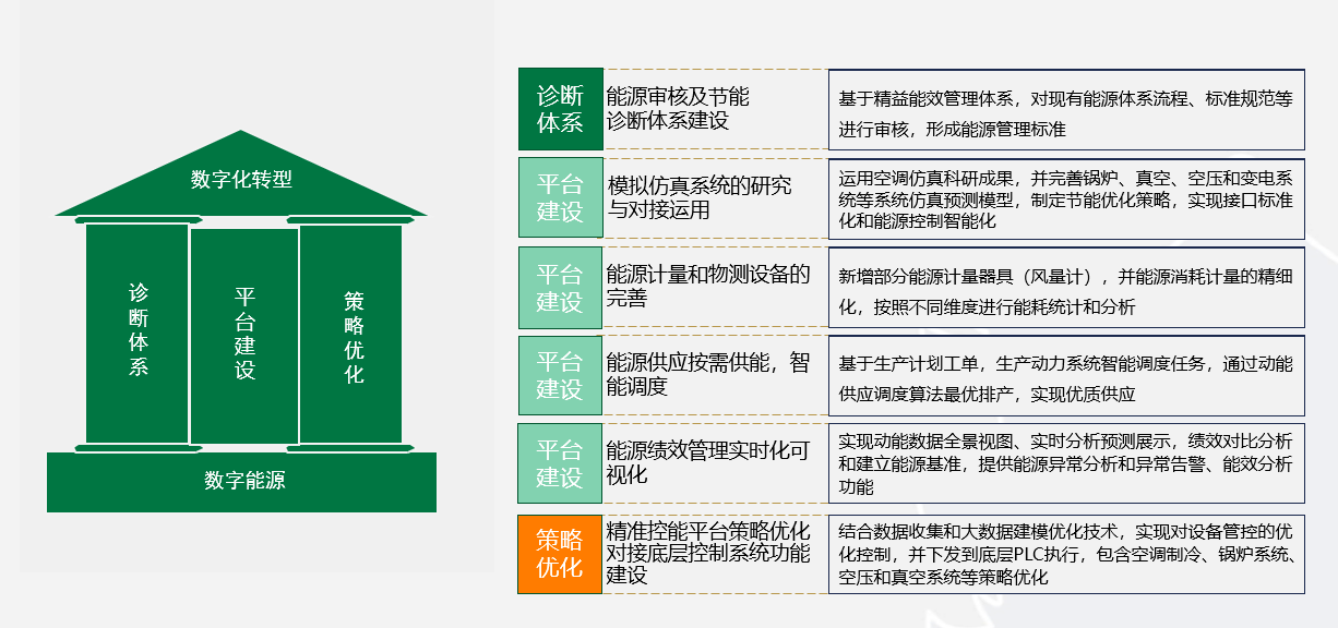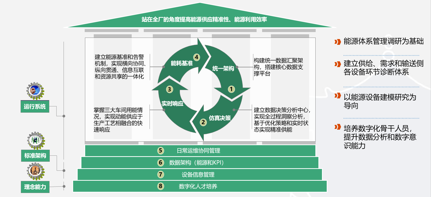 本項(xiàng)目旨在站在全廠的角度提高能源供應(yīng)精準(zhǔn)性、能源利用效率,能源體系管理調(diào)研為基礎(chǔ),建立供給、需求和輸送側(cè)各設(shè)備環(huán)節(jié)診斷體系,以能源設(shè)備建模研究為導(dǎo)向,培養(yǎng)數(shù)字化骨干人員,提升數(shù)據(jù)分析和數(shù)字意識(shí)能力。